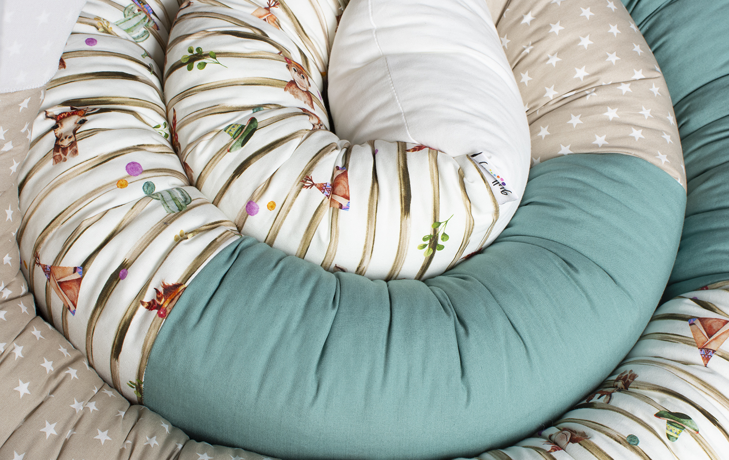 Sovgiraffen Julle har en mjuk, fin matchning av tyger. Här kombineras ett enfärgat tyg i färgen old green tillsammans med ett randigt tyg med giraffer och apor på och ett tyg med stjärnor i färgen beige. Föll du för kombinationen av tyger, men önskar ett annat sovdjur så går det självklart bra att beställa det.