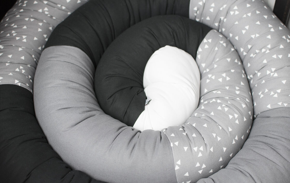Sovtigern Seth är en murrig rackare med sitt gråa tyg med vita trianglar och enfärgade tygerna grå och svart. Föll du för kombinationen av tyger, men önskar ett annat sovdjur så går det självklart bra att beställa det.